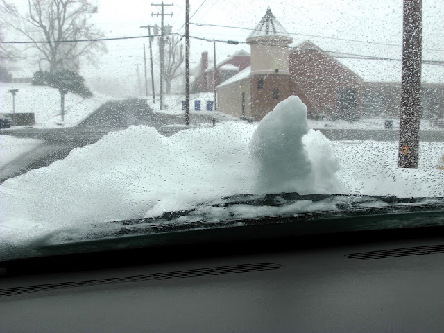 However, I've about reached my limit on this favorite winter precipitation. That's why the view from my rear-view mirror yesterday afternoon made me jump for joy and do cartwheels in the front yard of my place of employment.